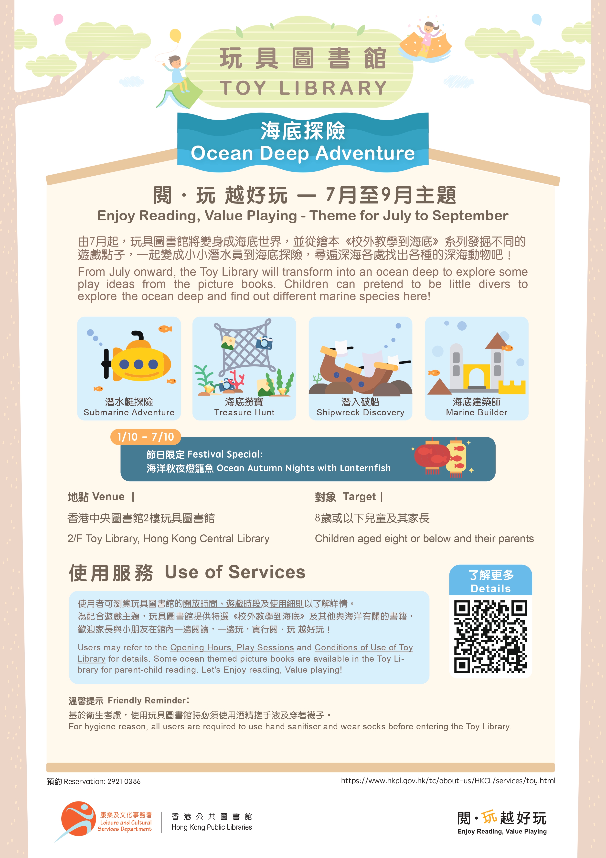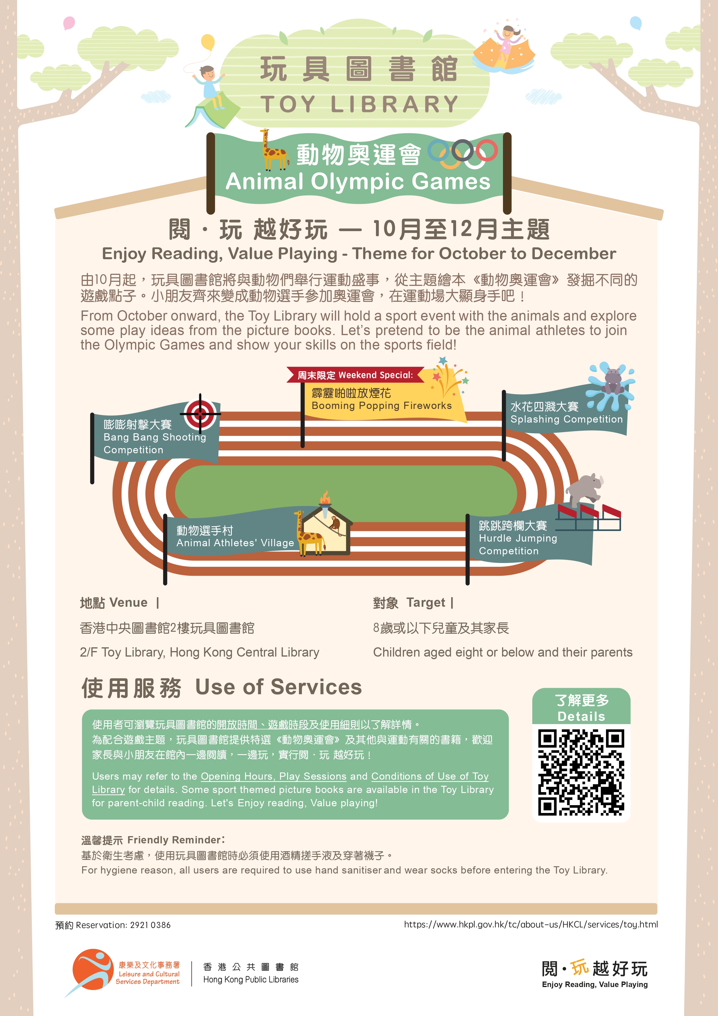 Reading and playing are indispensable to children’s development. Reading forms the basis of children’s play which requires them to put the knowledge obtained from books into practice. Playing enables children to experience with their limbs and associate things through the interaction of their five senses while reading guides them to explore the world and inspires their imagination. Integrating reading and playing, the Toy Library provides children with a parent-child play area for fun and joyful reading.