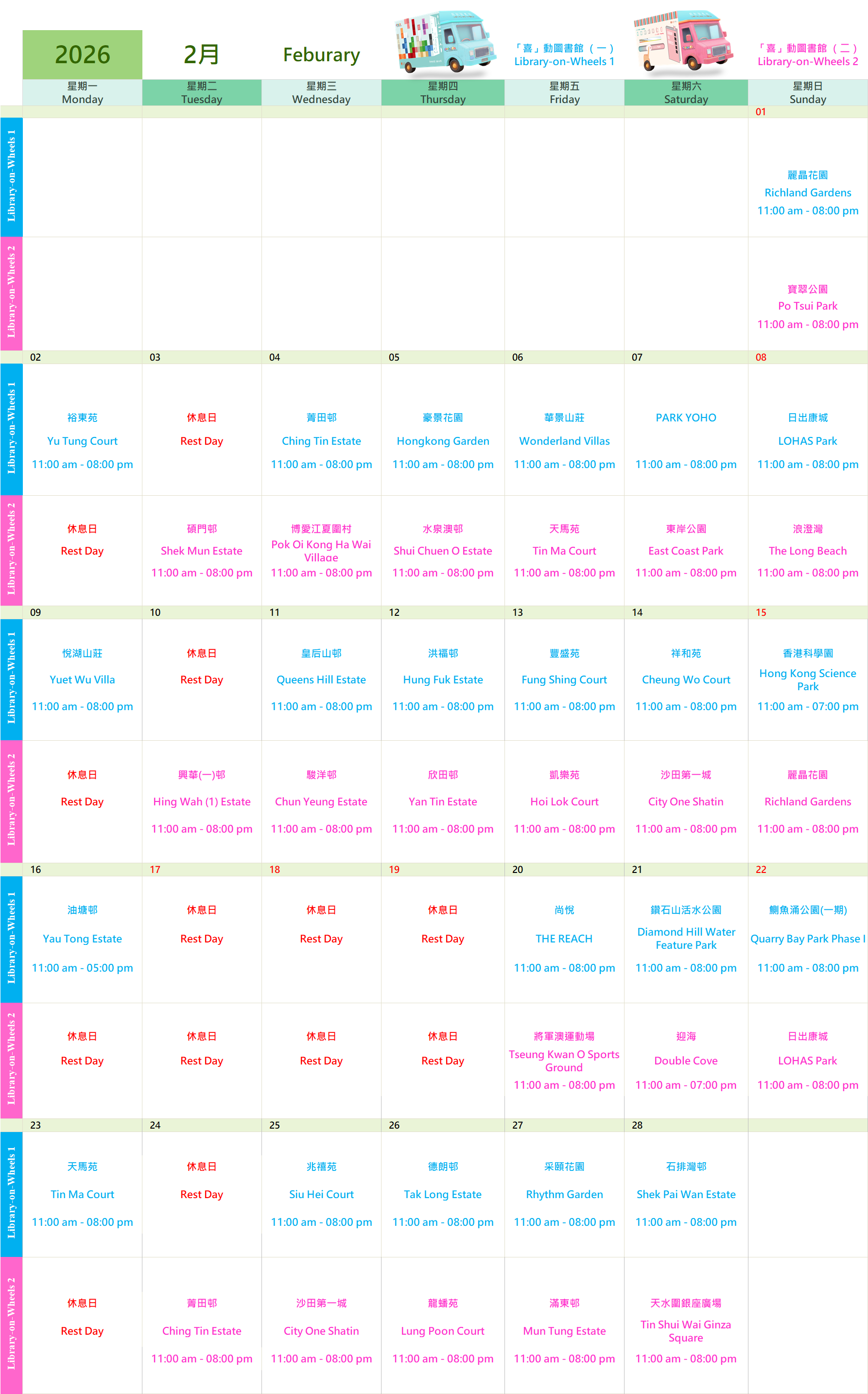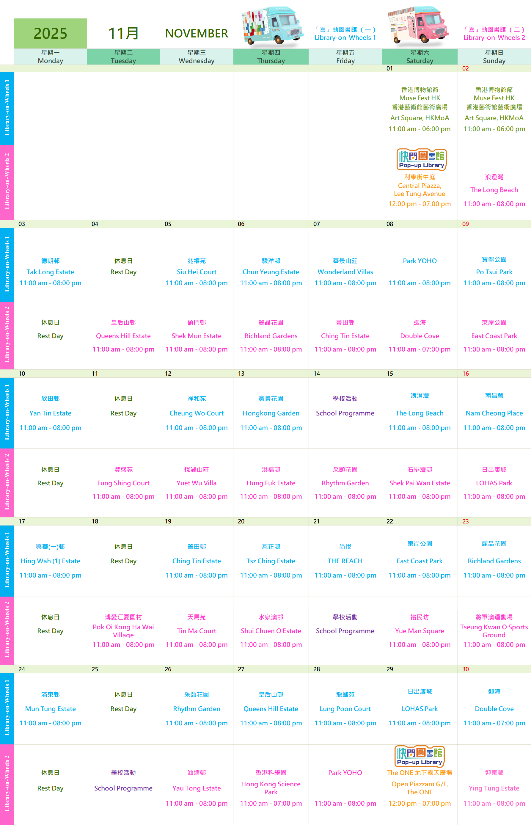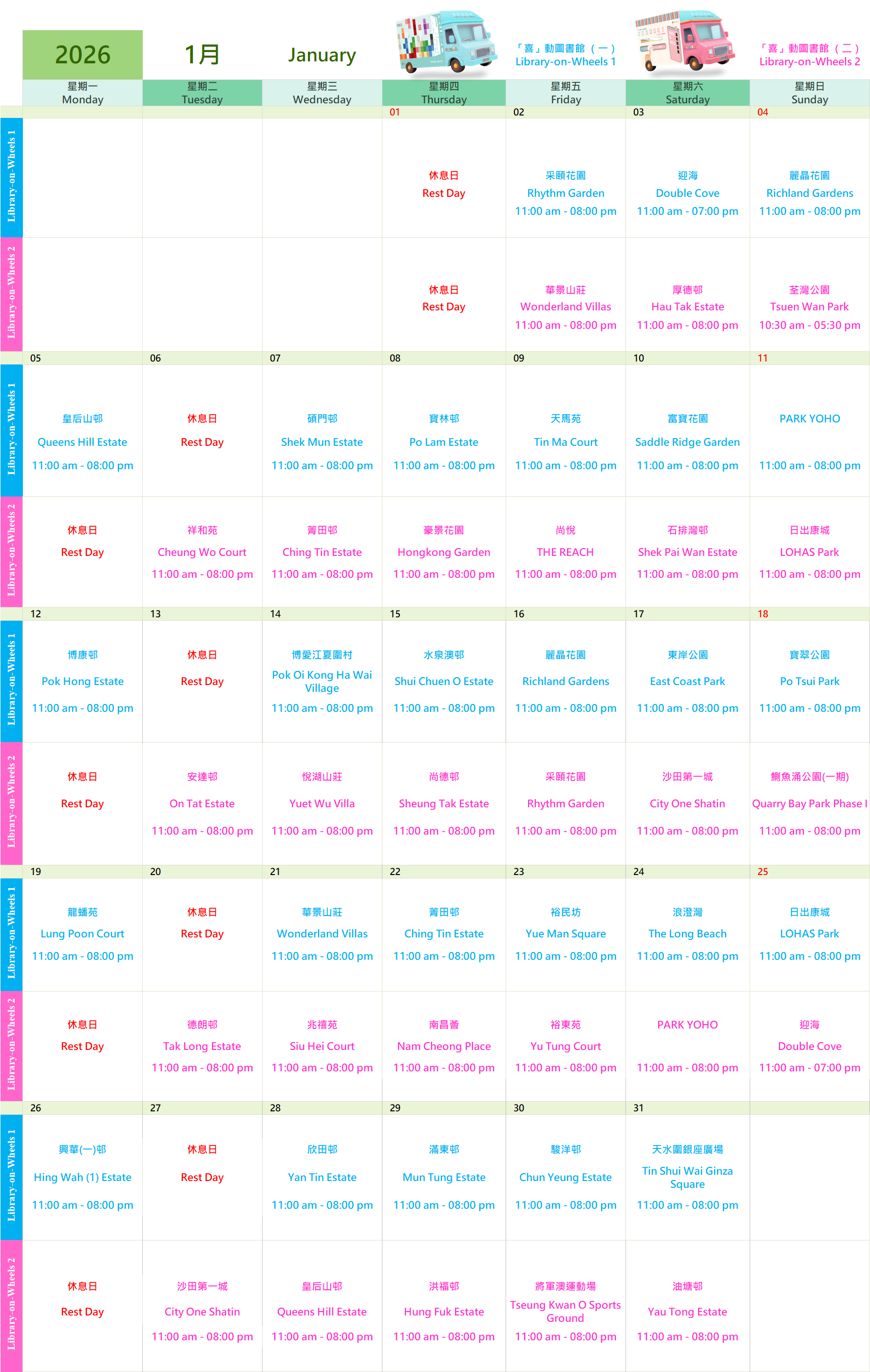 計劃亦會結合「快閃圖書館」活動,於週末或公眾假期在戶外舉行活潑及多元化的閱讀活動,讓市民大眾在社區享受閱讀的樂趣,體驗圖書館服務並可即場借閱圖書。![]()