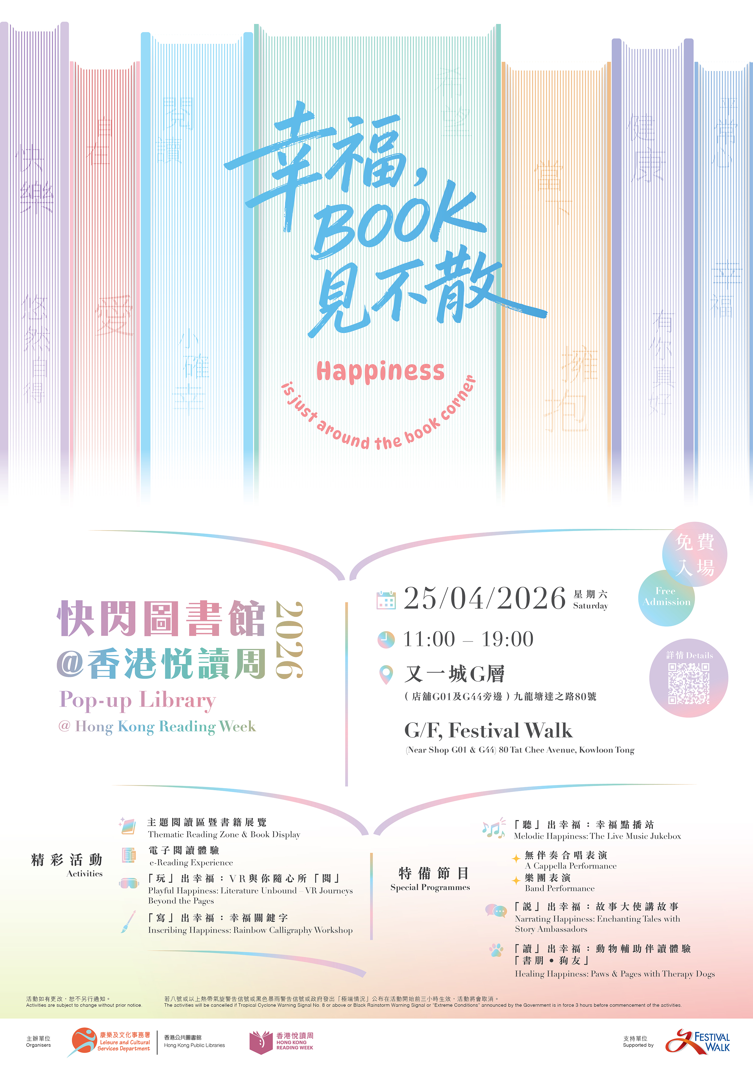 快閃圖書館@香港悅讀周載譽歸來,以「幸福,『BOOK』見不散」為題,在九龍塘又一城開闢一座沉浸式「閱讀實驗室」。不只重塑傳統閱讀的框架,更是一場集結「聽、說、讀、寫、玩」的五感幸福實驗!