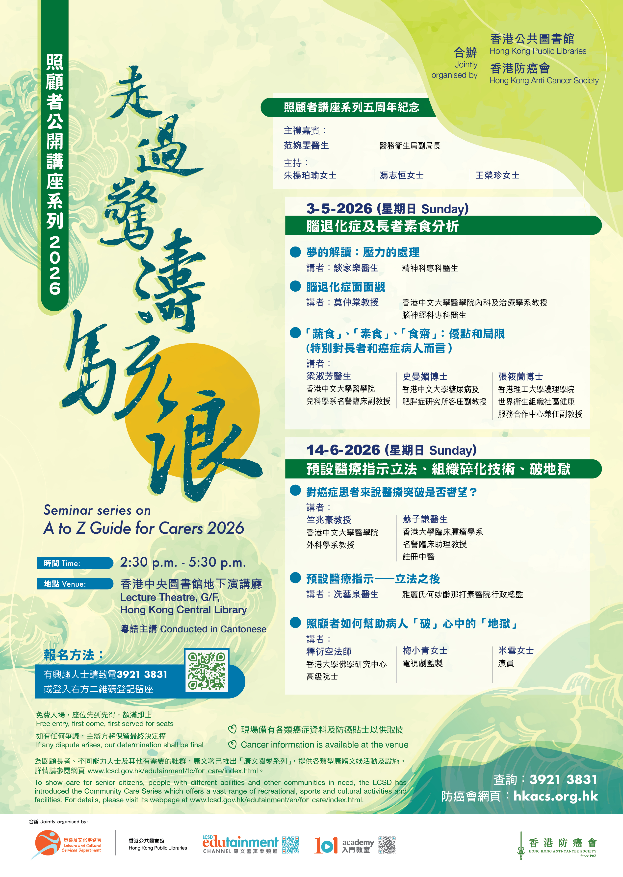 講座以粵語進行。 憑票免費入場,額滿即止。 報名方法:有興趣人士可由即日起,致電3921 3831或登入https://qr.link/vEd80x 登記留座。座位有限,先到先得,額滿即止。